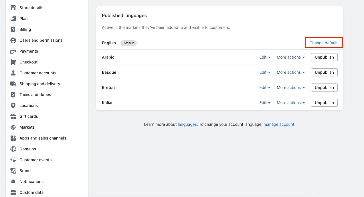 Step 2: Settings -> Languages -> Change default ->Change any default language