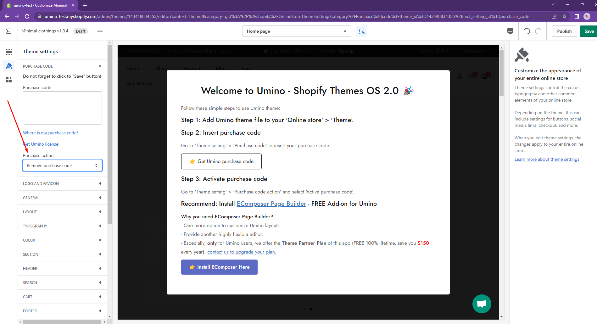 Please follow [this direction](https://blueskytechcos-organization.gitbook.io/umino-shopify/theme-installation/full-install-theme/activate-and-remove-purchase-code#2.-remove-purchase-code) for details