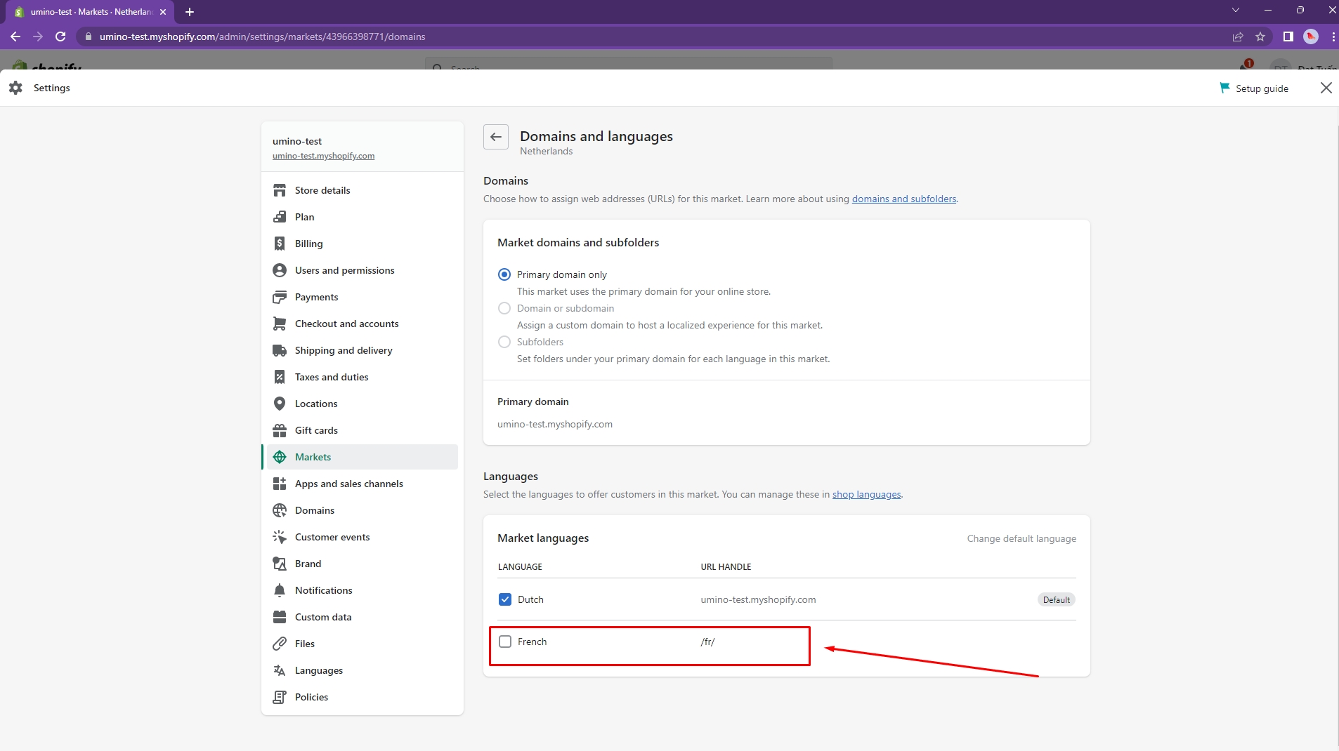 Click to Manage -> Domain and languages of your Primary market and tick to the new language you have just added.