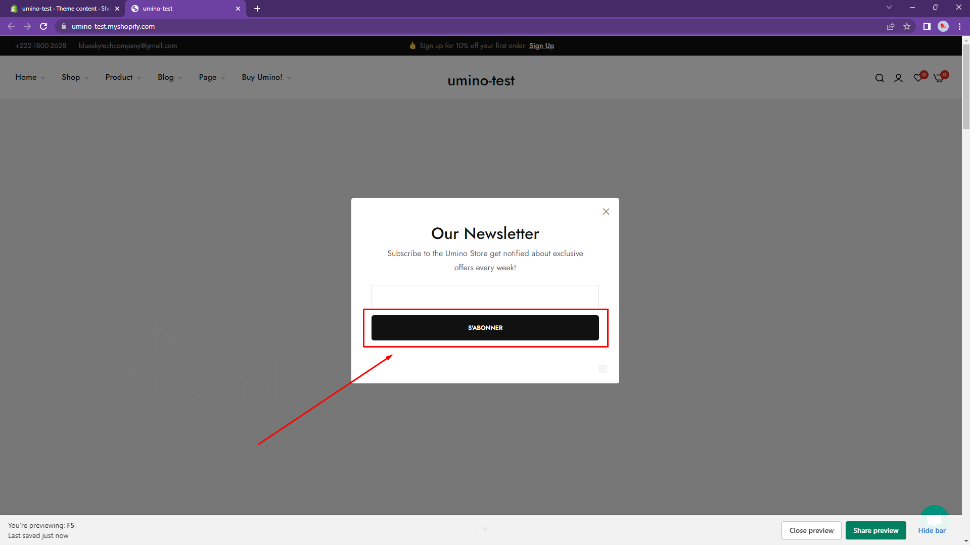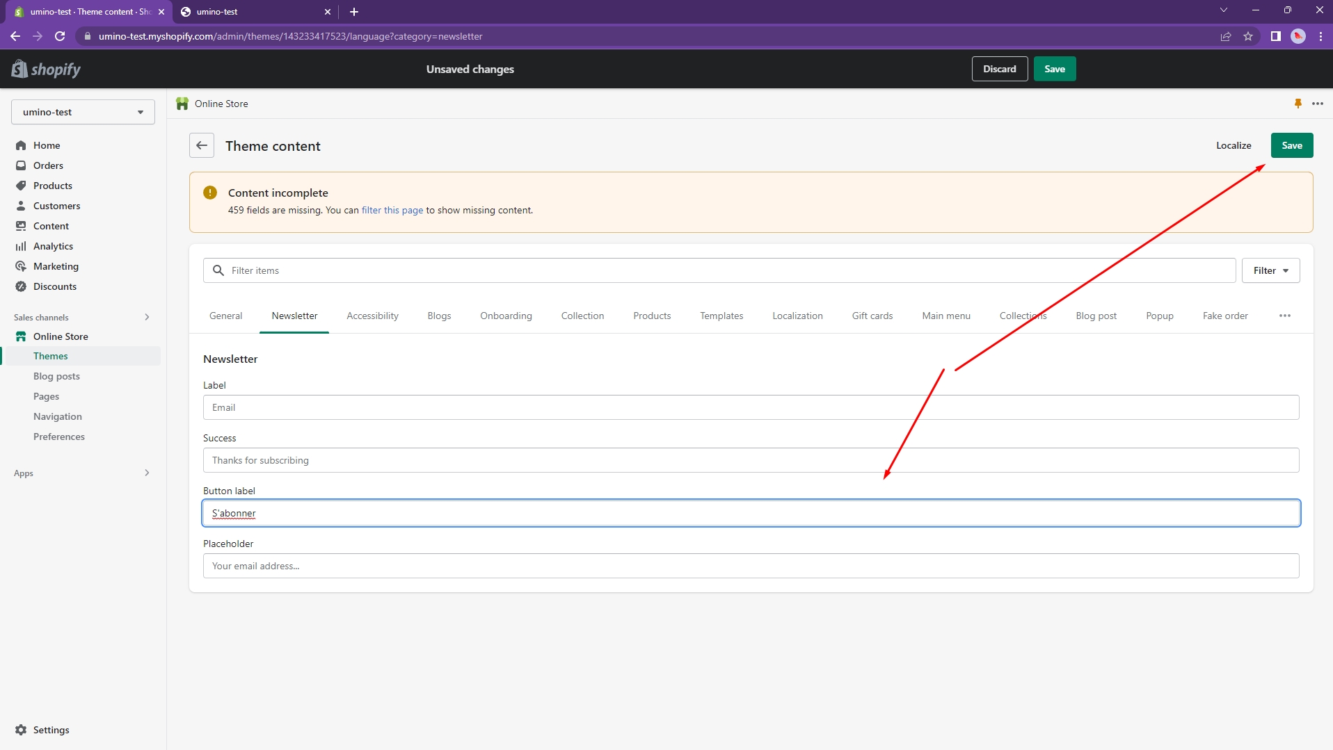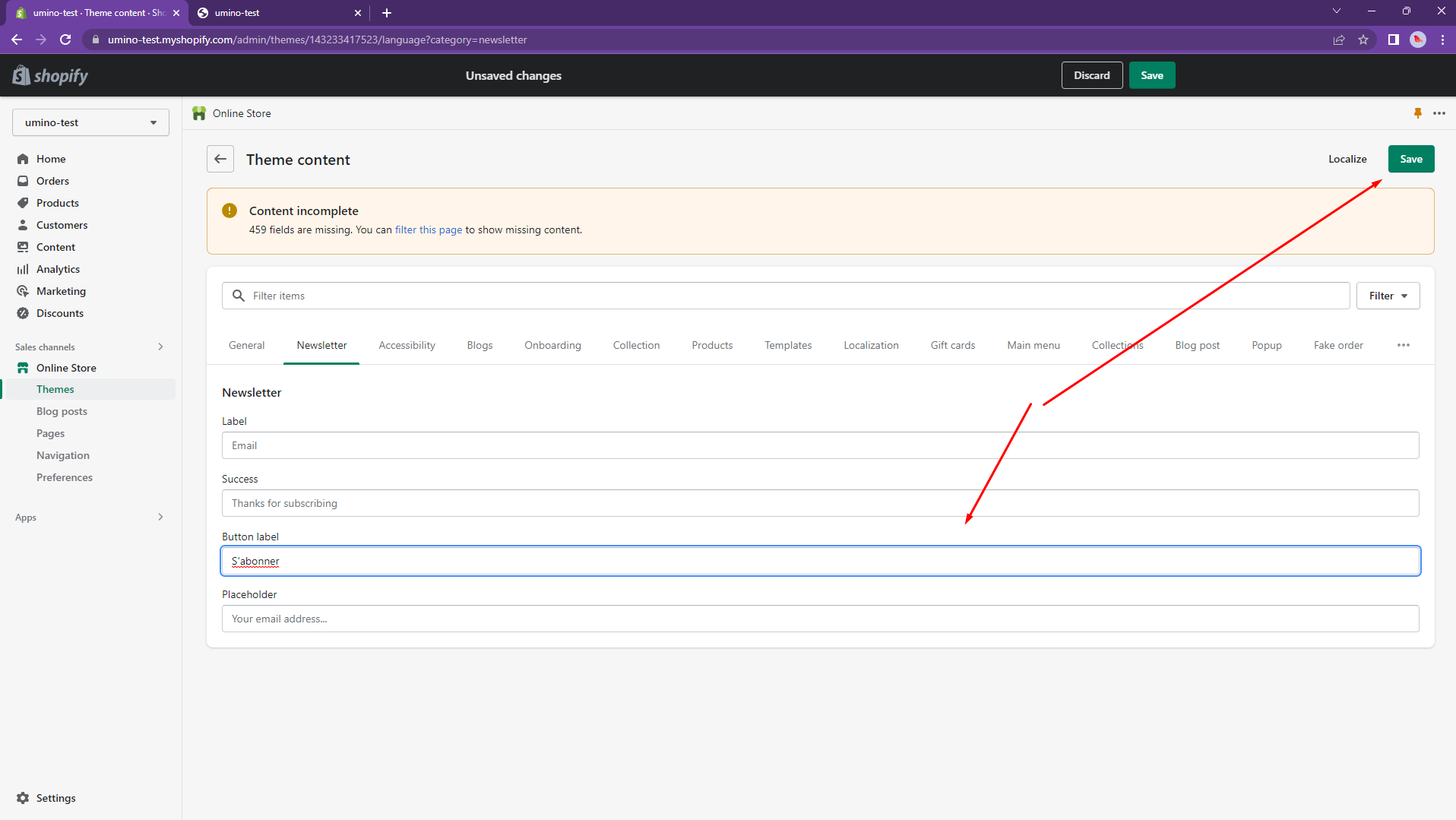 You can translate manually for each content. For example, I will translate the button Subscribe to French