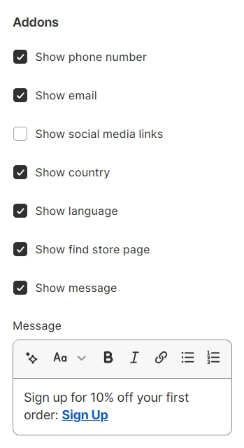 You can choose which addons to display on the top bar, and write a message to your customers.