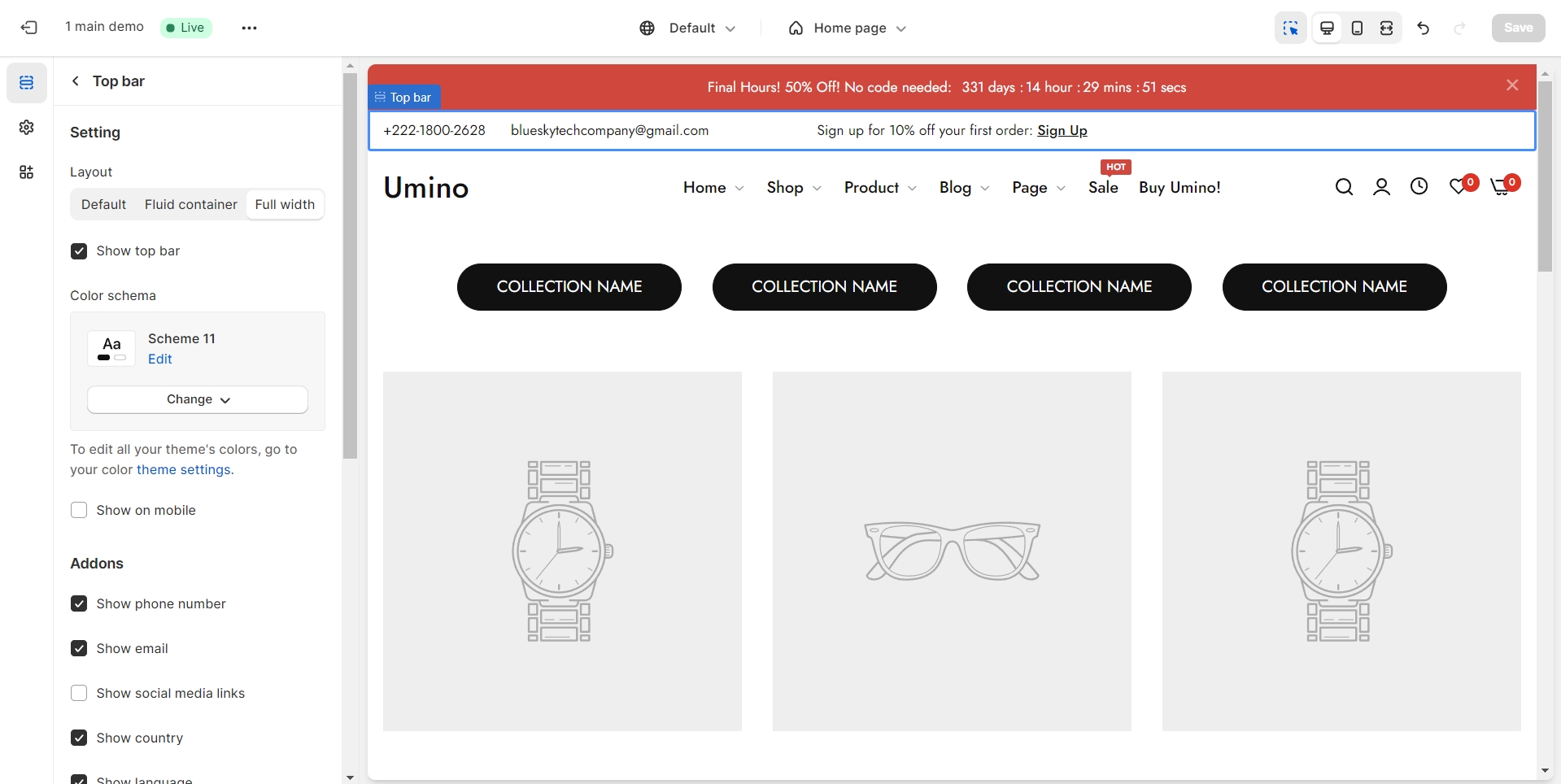 The top bar is a content block at the upper part of your website that appears on every page. It usually contains the language, country, and other elements such as a phone number, email, etc.