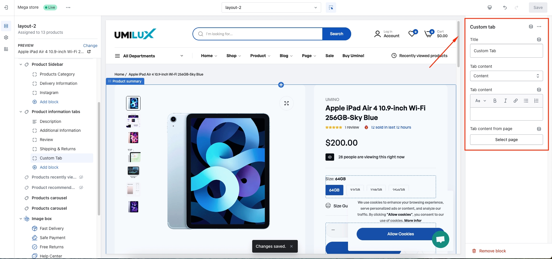 Step 2: Go back to the product page in Customize -> Product information tabs -> Add block Custom tab -> Tab content, choose the content page -> select the page you created in step 1 -> Save