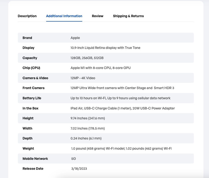 Tab Custom: Merchants add new content other than the products description such as shipping & return policy.