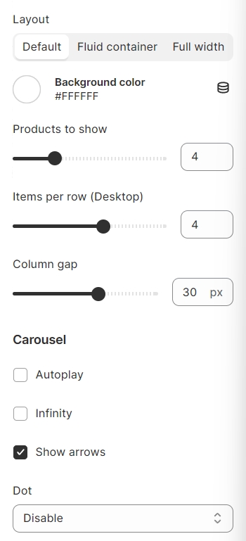 Products per row (between 1 and 4), and the column gap (between 0 and 50).