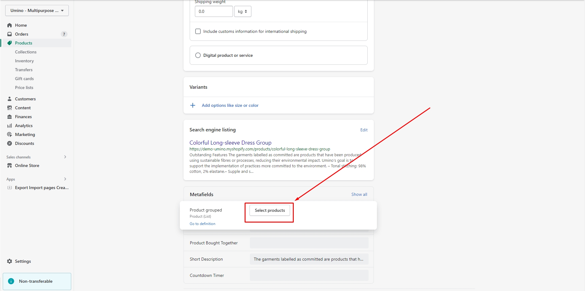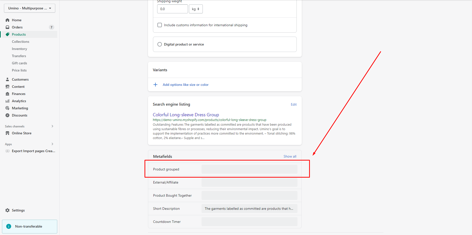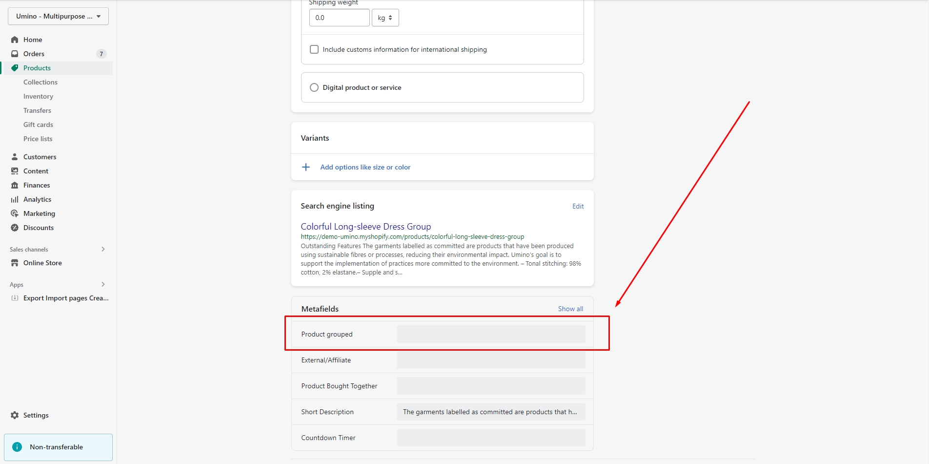 Scroll down to Metafields and click to Product grouped