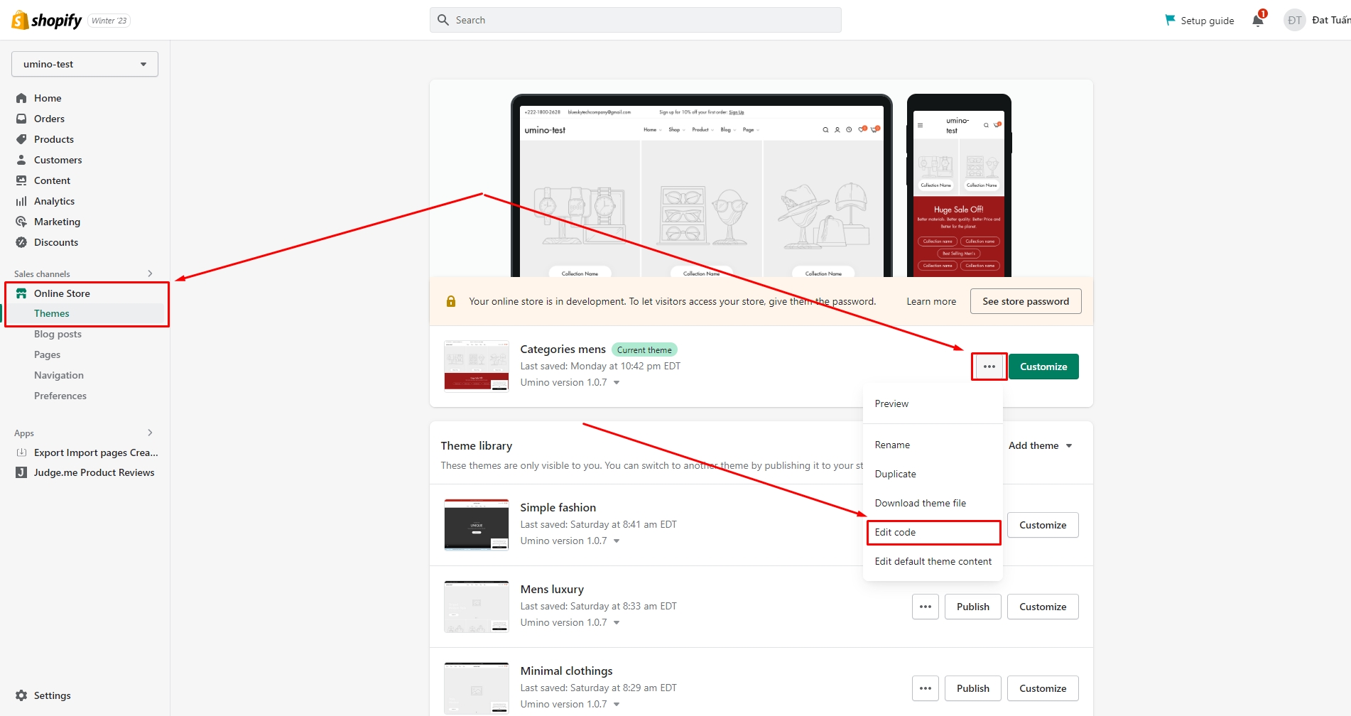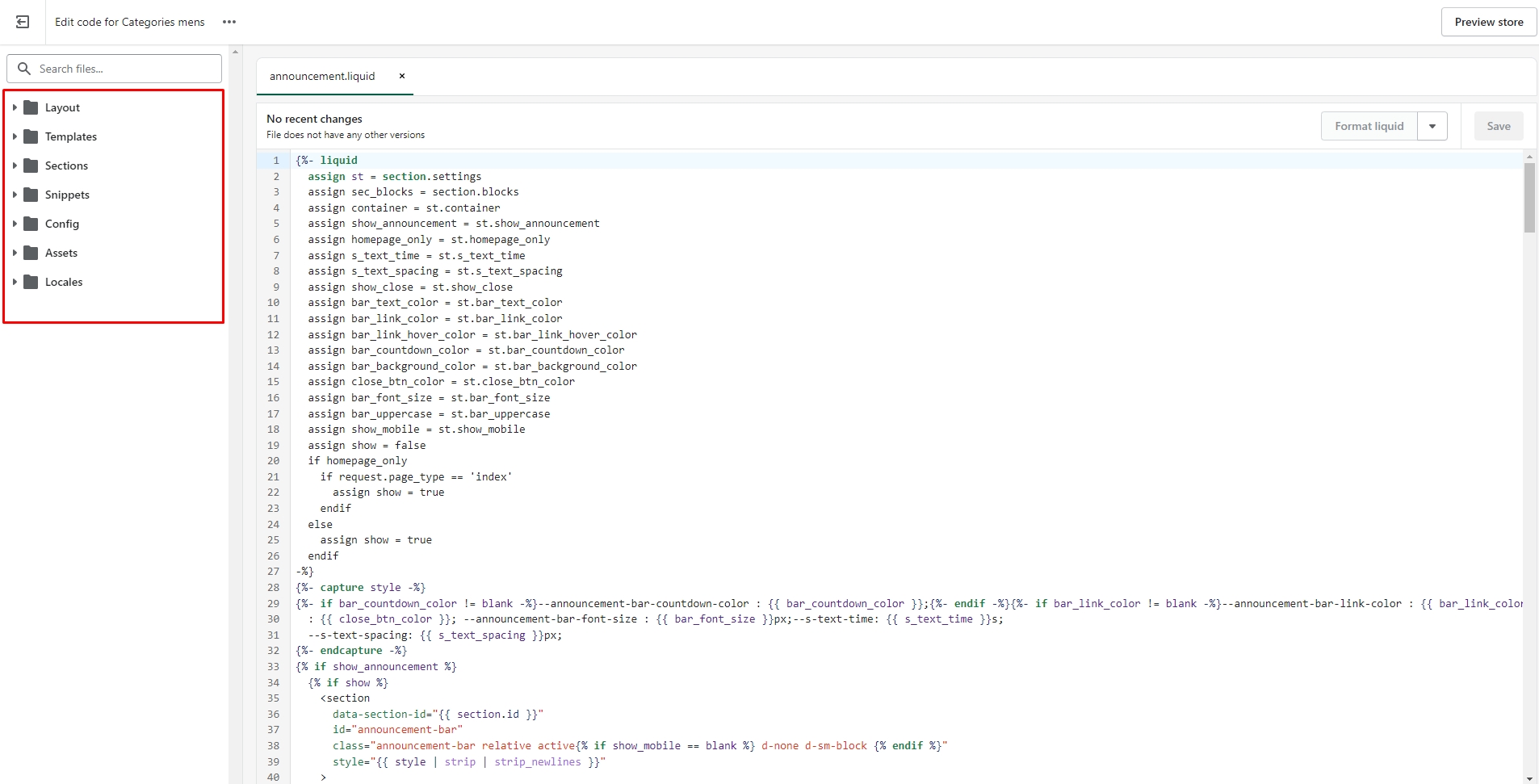 You can edit your theme code to make detailed changes to your online store. Most of the files that make up a theme contain Liquid, Shopify's templating language. Theme files also contain HTML, CSS, JSON, and JavaScript. Edit the code for a theme only if you know HTML and CSS, and have a basic understanding of Liquid.