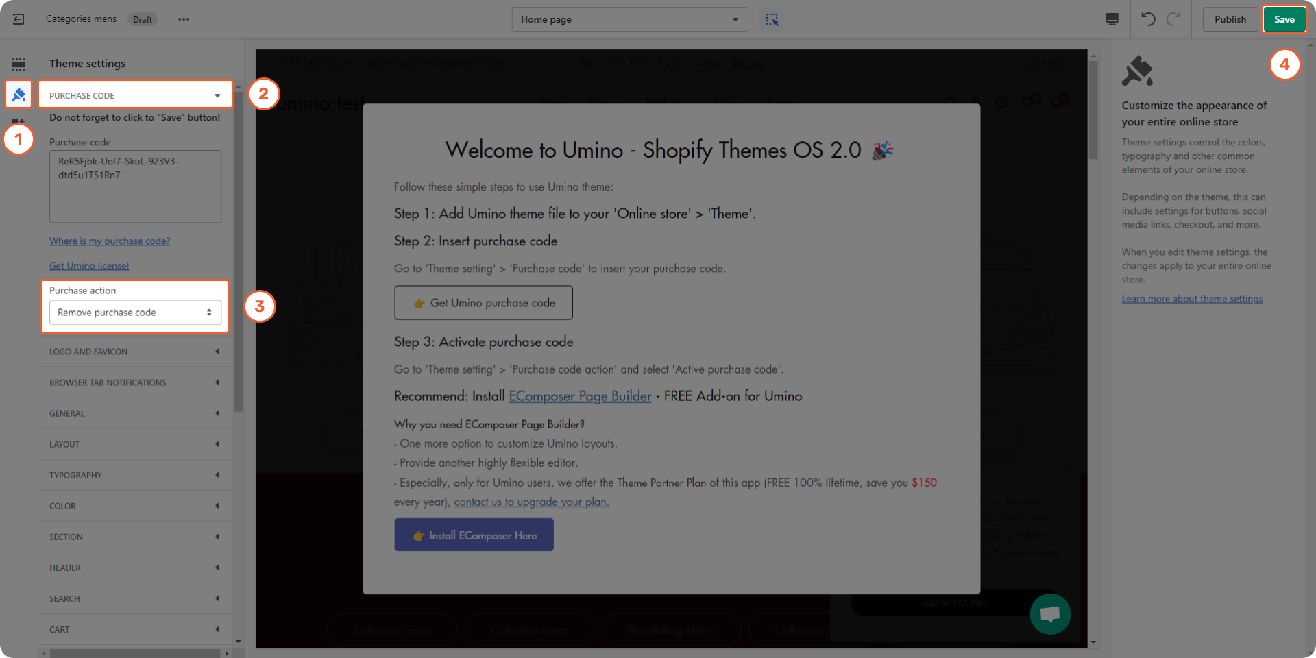 Step 3: Insert your Purchase Code and click Save