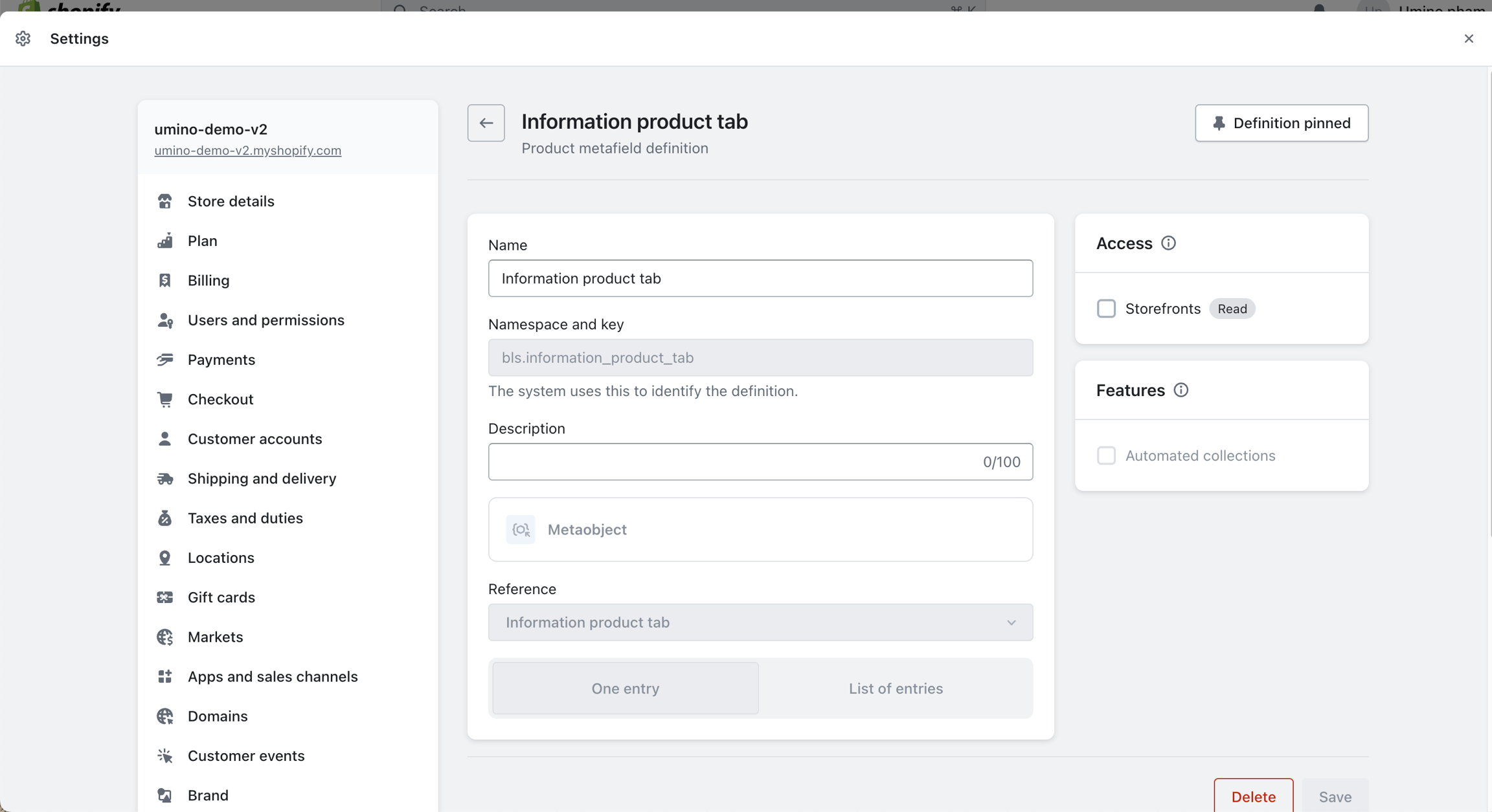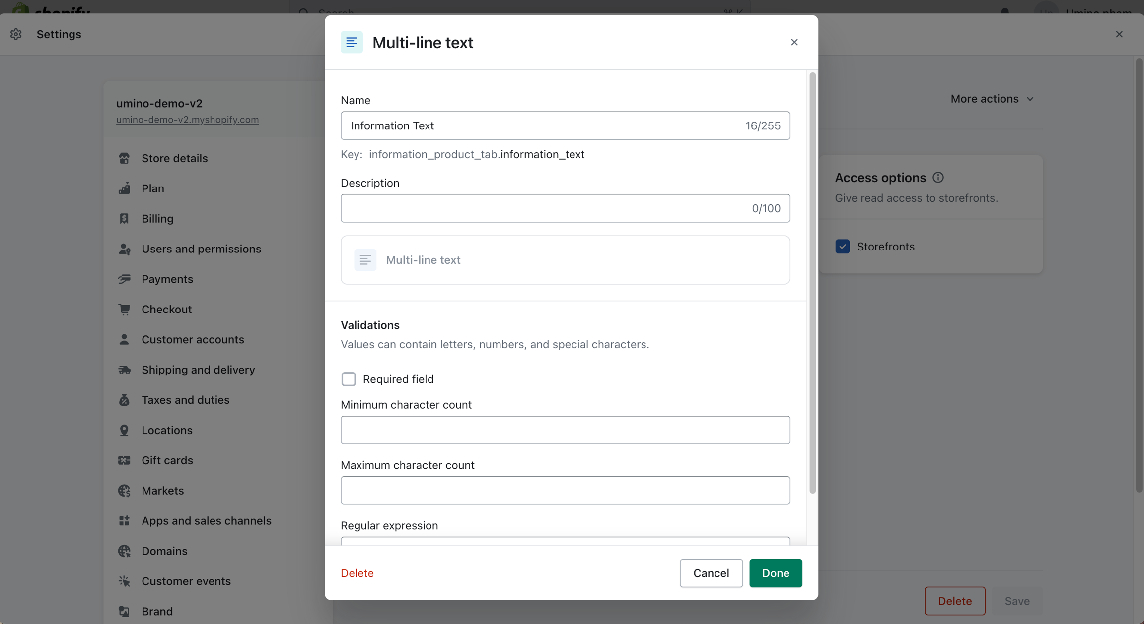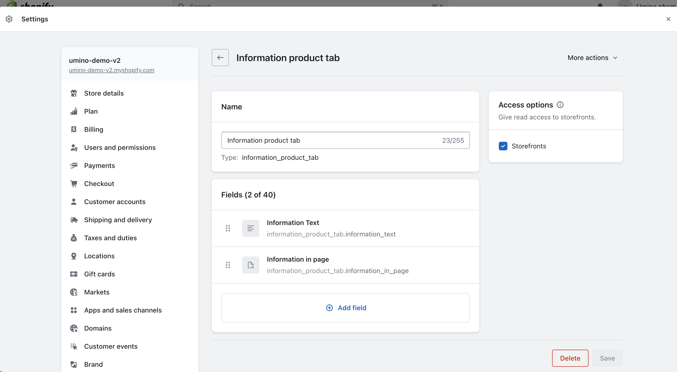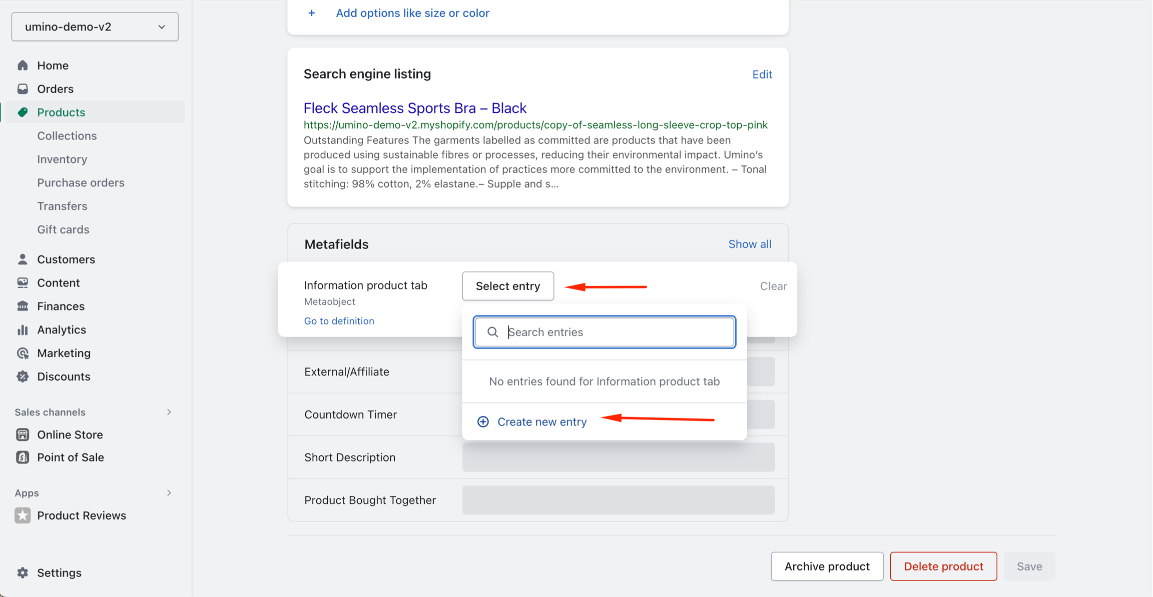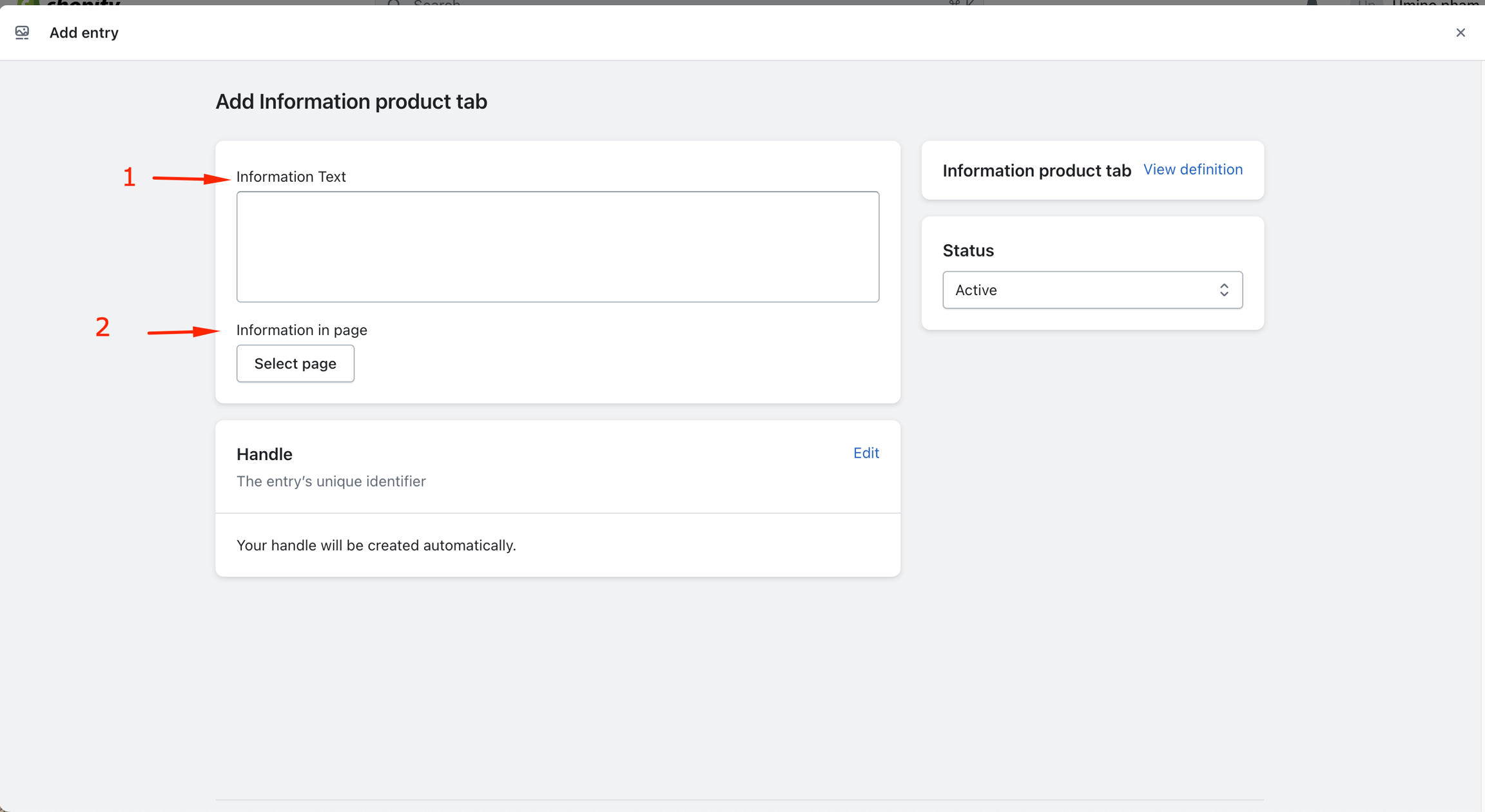 On Shopify homepage, go to Products and select the 'Information product tab' metafields to set the content you want to display for each product