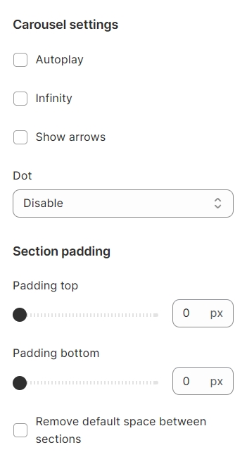 Select the behavior of your carousel by choosing from the following options: Autoplay, Infinity, and Show Arrows. Enabling Dot allows you to navigate directly to any existing slide.