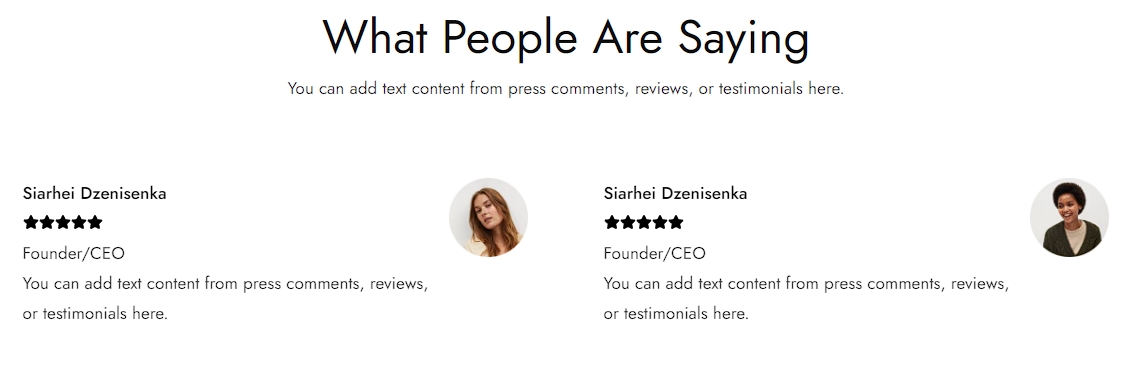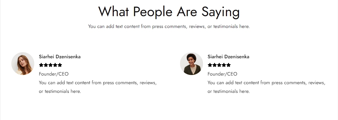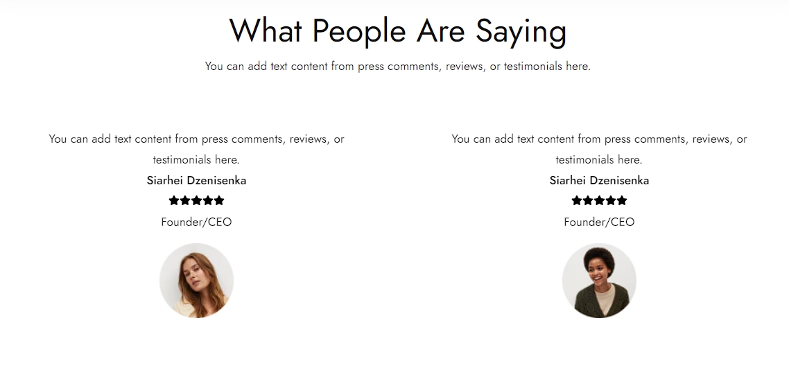 The Testimonials section lets you feature quotes from customers. It's a type of social proof that talks about your brand, service, and overall experience of your existing customers, building confidence and trust in your potential customers.