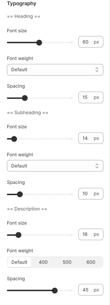 Utilize the provided setting options to change the position and font of the heading, subheading and description.