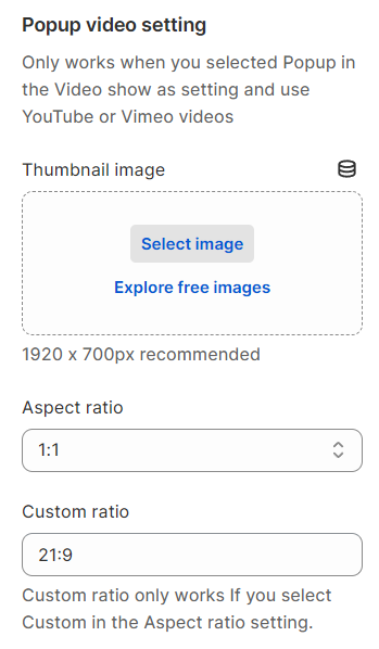 Add a Youtube video link and adjust its ratio. The video image cover can be left blank if you want to use the video thumbnail.