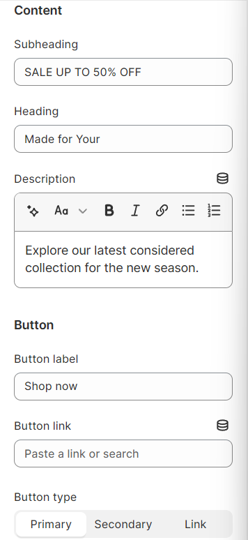 Add focal point: This feature helps you select the most important part of an image for your store. It ensures that the focal points of the image always remain visible, even if a section crops the image to fit the layout.