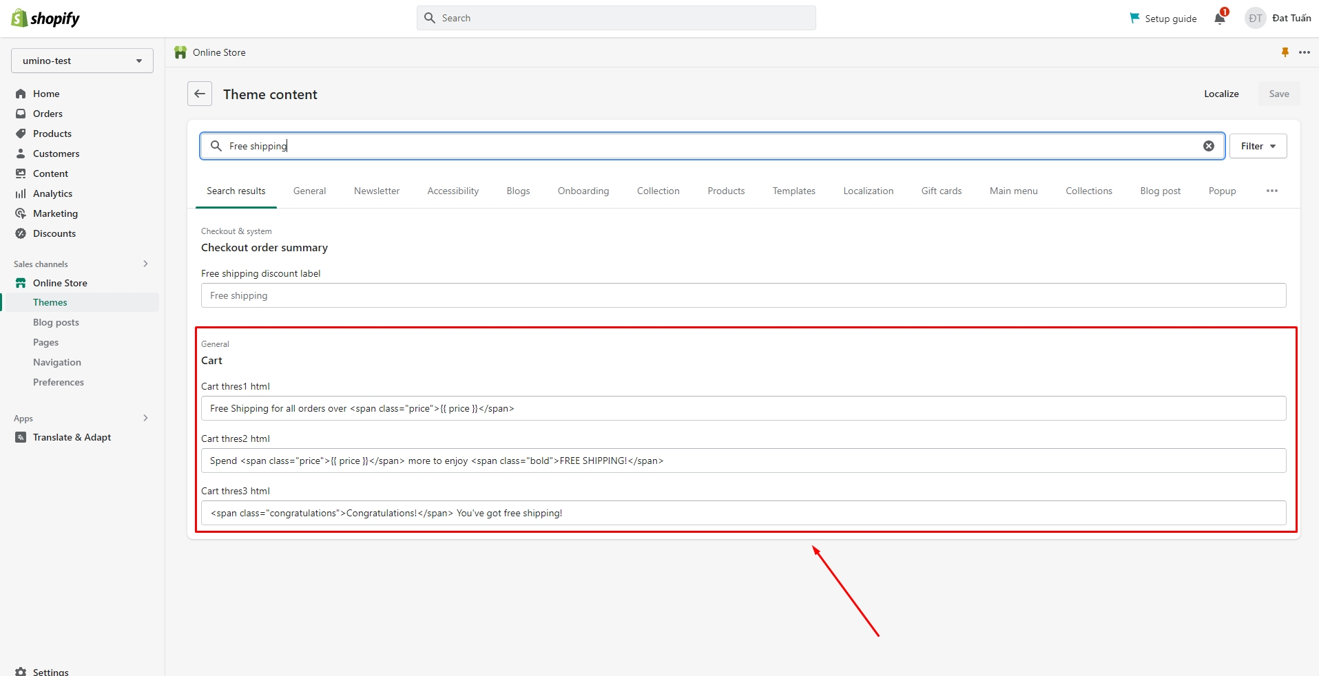 Search keywords "Free shipping" and edit the message in section Cart as you wish