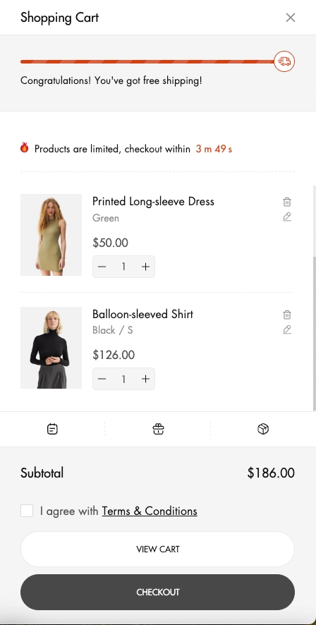 The cart drawer is a slide where the cart information will show. A side pops up whenever customers add an item to the cart, offering customers to continue shopping while they can see the cart information. Customers can also edit the quantity or add a specific note.