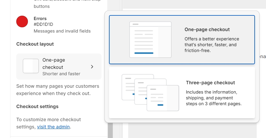 In a One-page checkout, customers will navigate through information, shipping, and payment, all within a single page. Conversely, in a Three-page checkout, these details will be spread across three individual pages.