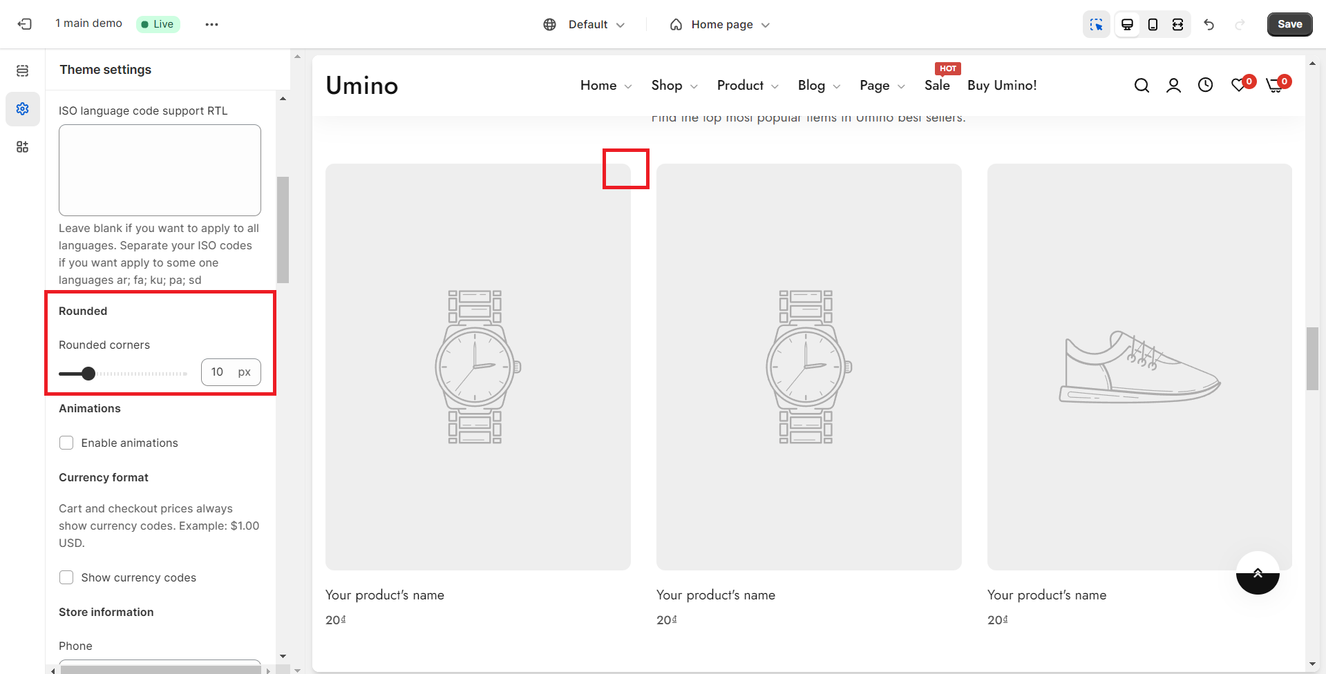 Explore the Border radius settings in this theme setting to adjust the corners of every product container. Tailor the appearance of each item with precision, modifying the border radius to meet your specific design preferences.