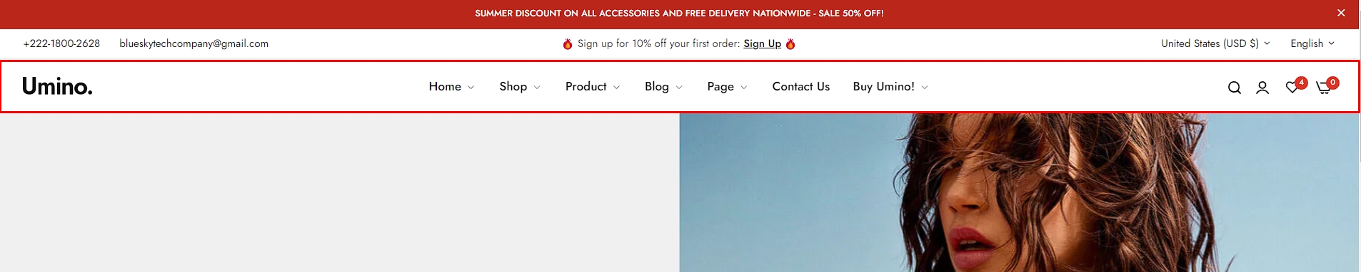 You can freely customize your header to suit your business needs by adding your logo image, choosing the main menu, and other addons using umino theme.