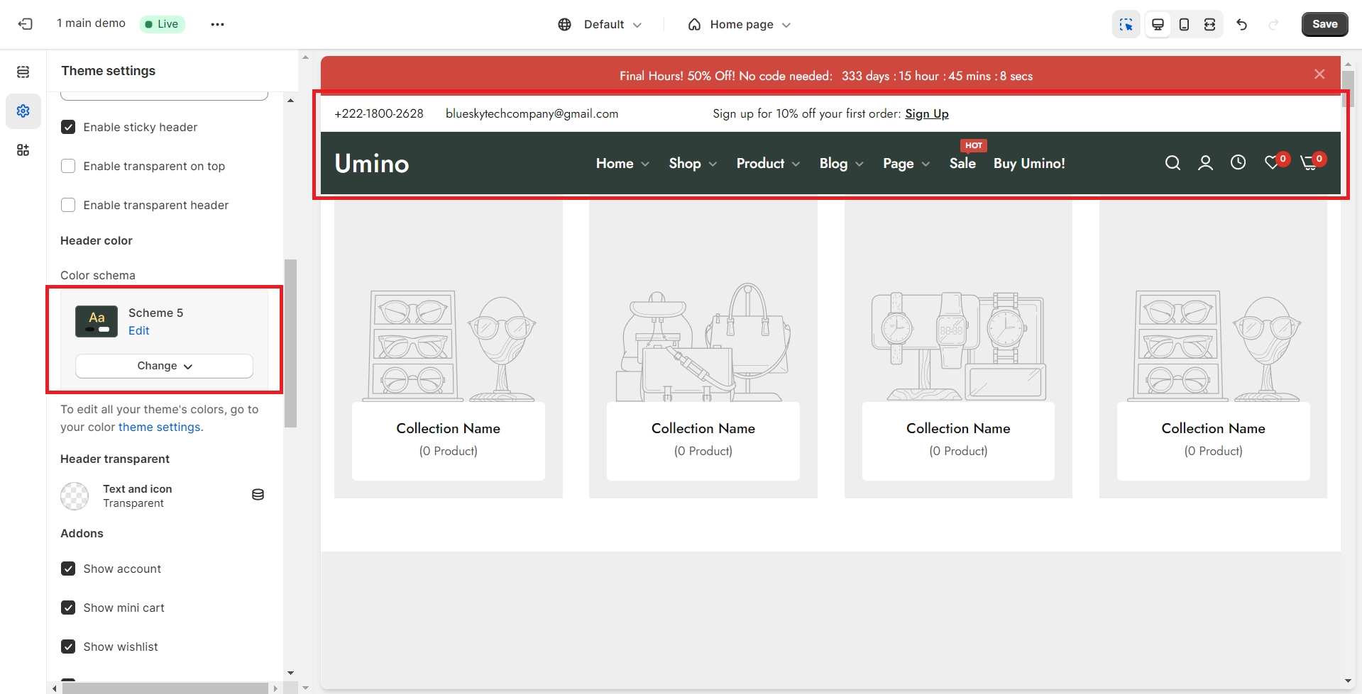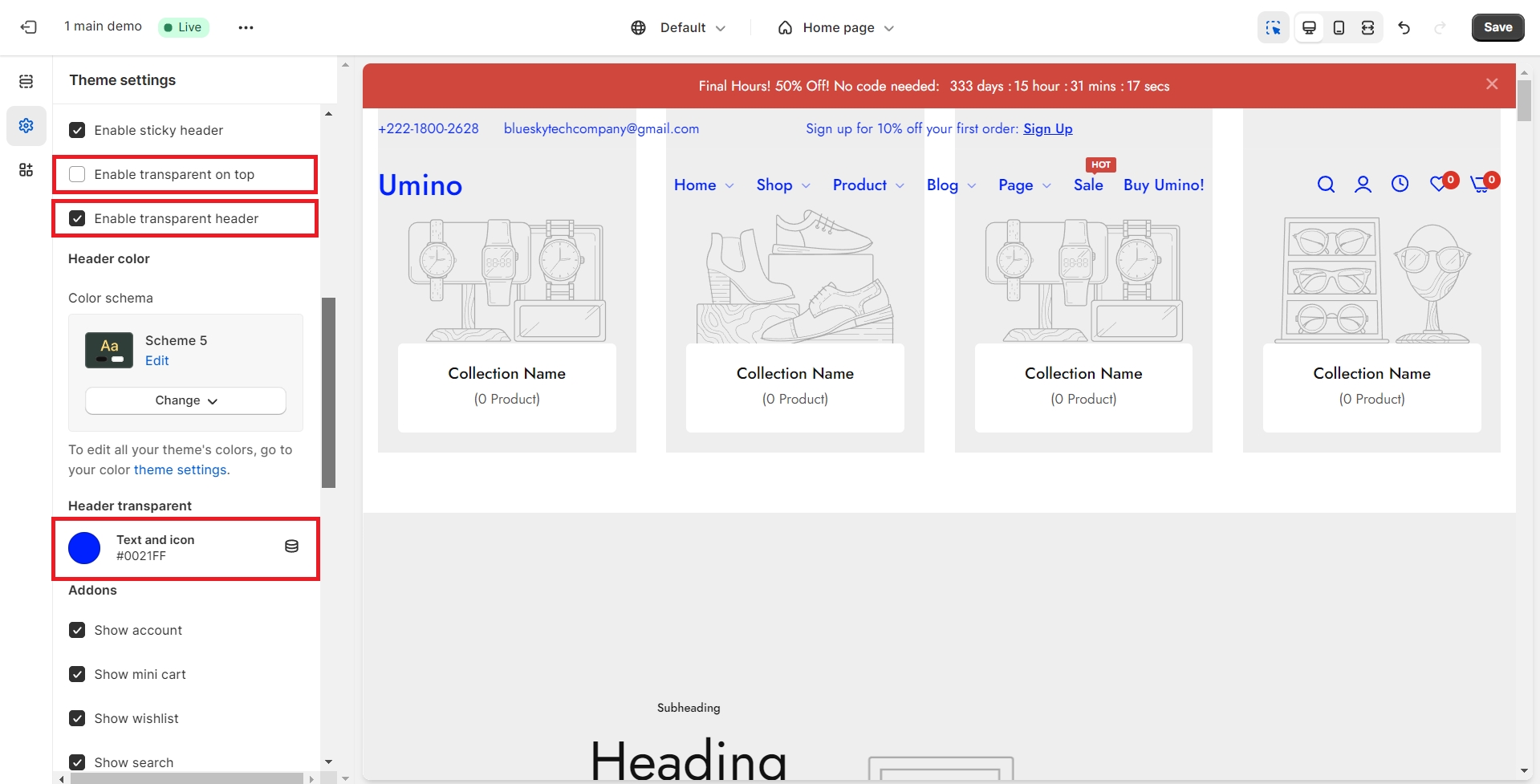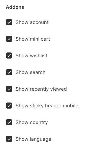 Addons provide extra settings to the header such as search, account, mini cart, etc. by enabling the suitable checkboxes.