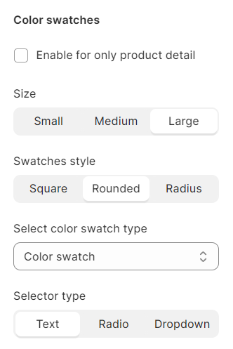 Color swatches is used to provide a visual representation of various options available for a product. For instance: color, material, ...