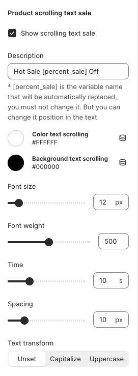 Go to Theme setting => Product => Product scrolling text sale and check "Show scrolling text sale." Additionally, we provide various options to make customization easy for you.